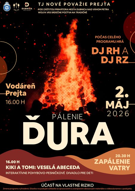 ÚvodKde, kedy, čoDubnica nad Váhom, 2.5.2026, Pálenie Ďura Kde, kedy, čo Dubnica nad Váhom, 2.5.2026, Pálenie Ďura Od Robert Zvonár 25. apríla 2026 0 9 FacebookXPinterestWhatsApp Viac na: https://www.kultura.dubnica.eu/klient-958/stranka-9050/film-829146 Tagy#DJ RH#DJ RZ#Dubnica nad Váhom#KIKI a TOMI#Mesto Dubnica nad Váhom#Pálenie Ďura#Pálenie vatry#Prejta#TJ Nové Považie Prejta#Vodáreň Prejta FacebookXPinterestWhatsApp Predchádzajúci článokLadce, 2.5.2026, Ladecký kotlíkĎalší článokTrenčín, 2.5.2026, Deň hasičov SÚVISIACE ČLÁNKY Kde, kedy, čo Trenčín, 2.5.2026, Deň hasičov Kde, kedy, čo Ladce, 2.5.2026, Ladecký kotlík Kde, kedy, čo Dolná Maríková, 1.5.2026, Terchovienky z dolniak