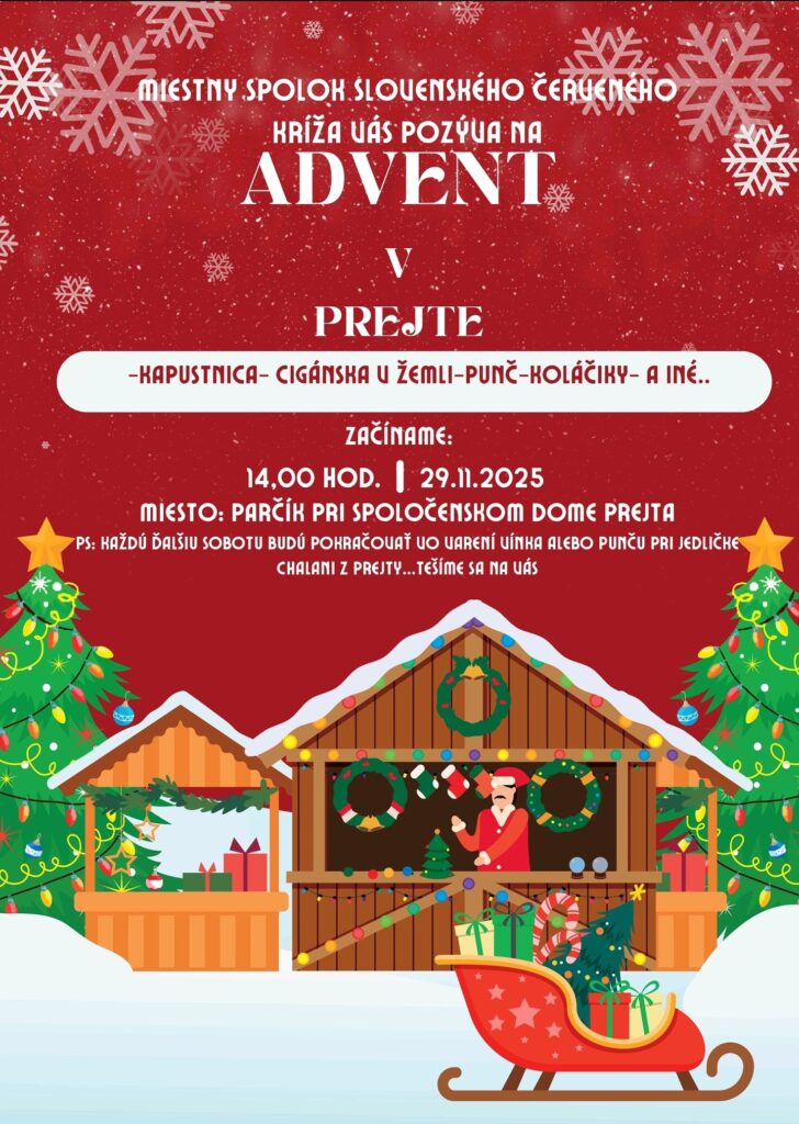 ÚvodKde, kedy, čoDubnica nad Váhom-Prejta, 29.11.2025, Advent v Prejte Kde, kedy, čo Dubnica nad Váhom-Prejta, 29.11.2025, Advent v Prejte Od Robert Zvonár 27. novembra 2025 0 132 FacebookXPinterestWhatsApp Tagy#Dubnica nad Váhom#Dubnica nad Váhom-Prejta#Miestny spolok Červeného kríža Dubnica nad Váhom/Prejta FacebookXPinterestWhatsApp Predchádzajúci článokTrenčín, 30.11.2025, Čarovný adventĎalší článokTrenčianska Teplá, 1.12.2025 – 15.12.2025, Výstava betlehemov a Vianočných ozdôb. SÚVISIACE ČLÁNKY Kde, kedy, čo Trenčianske Teplice, 6.5 a 3.6.2026, Koncerty SZUŠ Trenčianske Teplice 2026 Kde, kedy, čo Dubnica nad Váhom, 6.5.2026, Detský raj s rodičmi Kde, kedy, čo Trenčín, 2.5.2026, Deň hasičov
