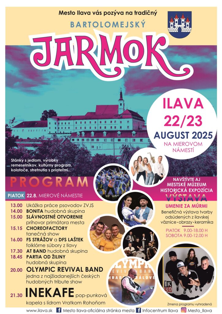 ÚvodKde, kedy, čoIlava, 22. a 23.8.2025, Bartolomejský jarmok Kde, kedy, čo Ilava, 22. a 23.8.2025, Bartolomejský jarmok Od Robert Zvonár 15. augusta 2025 0 328 FacebookXPinterestWhatsApp Tagy#Bartolomejský jarmok#Choreofactory#DFS Laštek Ilava#FS Strážov Ilava#HSk AT Band#HSk Bonita#HSk IneKafe#HSk Olympic Revival Band#HSk Partia od Žiliny#Ilava#Mesto Ilava#Mierové námestie Ilava#Psovodi ZVJS#Výstava FacebookXPinterestWhatsApp Predchádzajúci článokDubnica nad Váhom, 22.8.2025, Detské divadelné predstavenie Kvak a Čľup – Stratený gombíkĎalší článokTrenčín, 22.8.2025, Palackého naživo SÚVISIACE ČLÁNKY Kde, kedy, čo Ladce, 2.5.2026, Ladecký kotlík Kde, kedy, čo Dubnica nad Váhom, 2.5.2026, Pálenie Ďura Kde, kedy, čo Trenčín, 2.5.2026, Deň hasičov