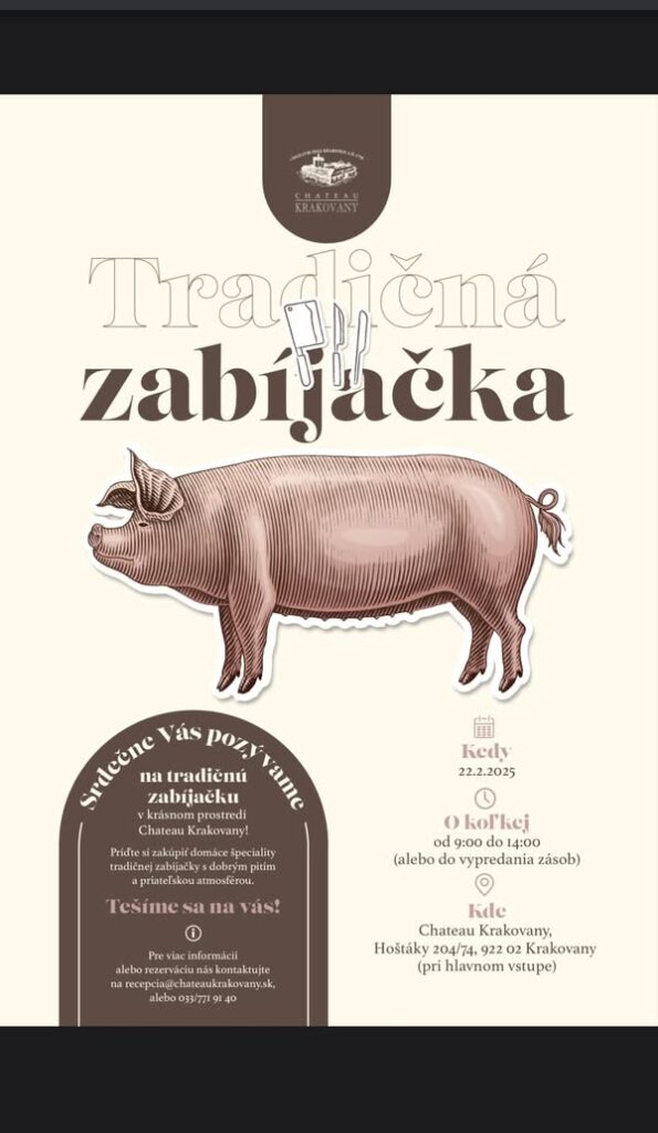 ÚvodKde, kedy, čoKrakovany, 22.2.2025, Tradičná zabíjačka Kde, kedy, čo Krakovany, 22.2.2025, Tradičná zabíjačka Od Robert Zvonár 21. februára 2025 0 124 FacebookXPinterestWhatsApp Tagy#Chateau Krakovany#Krakovany#Tradičná zabíjačka FacebookXPinterestWhatsApp Predchádzajúci článokKurací paprikáš s haluškamiĎalší článokDubnica nad Váhom, 26.2.2025, Pozvánka na 16. plánované MsZ Dubnica nad Váhom SÚVISIACE ČLÁNKY Kde, kedy, čo Ladce, 2.5.2026, Ladecký kotlík Kde, kedy, čo Dubnica nad Váhom, 2.5.2026, Pálenie Ďura Kde, kedy, čo Trenčín, 2.5.2026, Deň hasičov