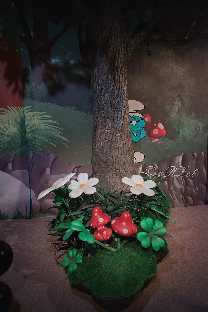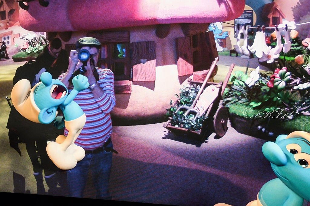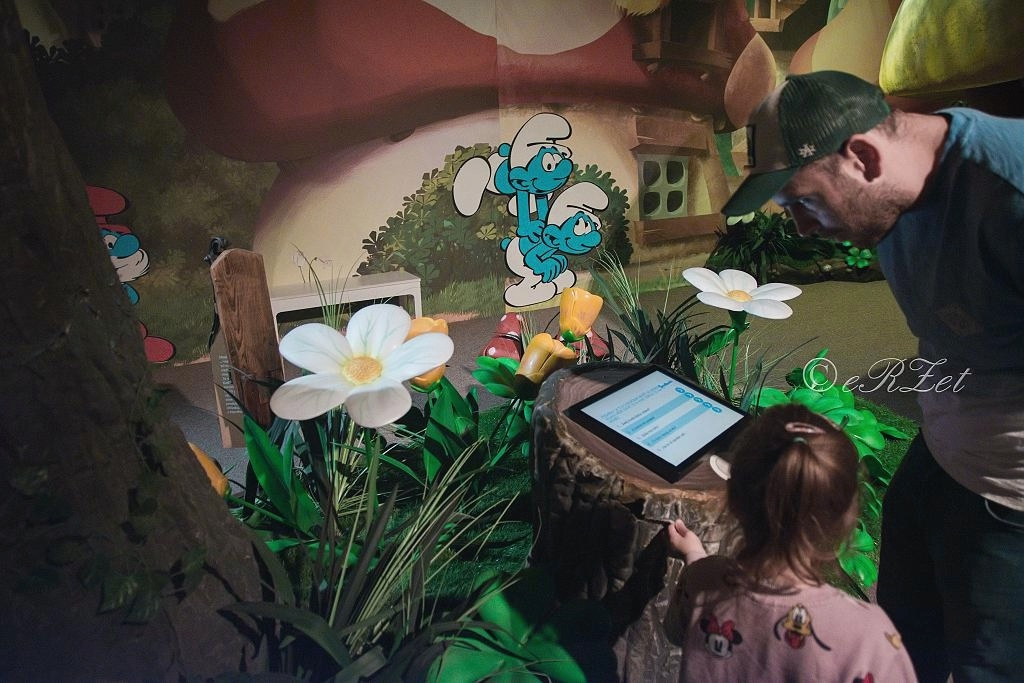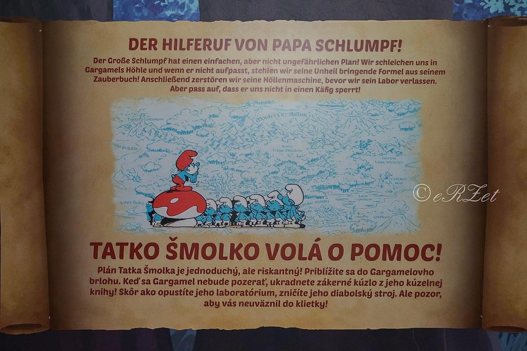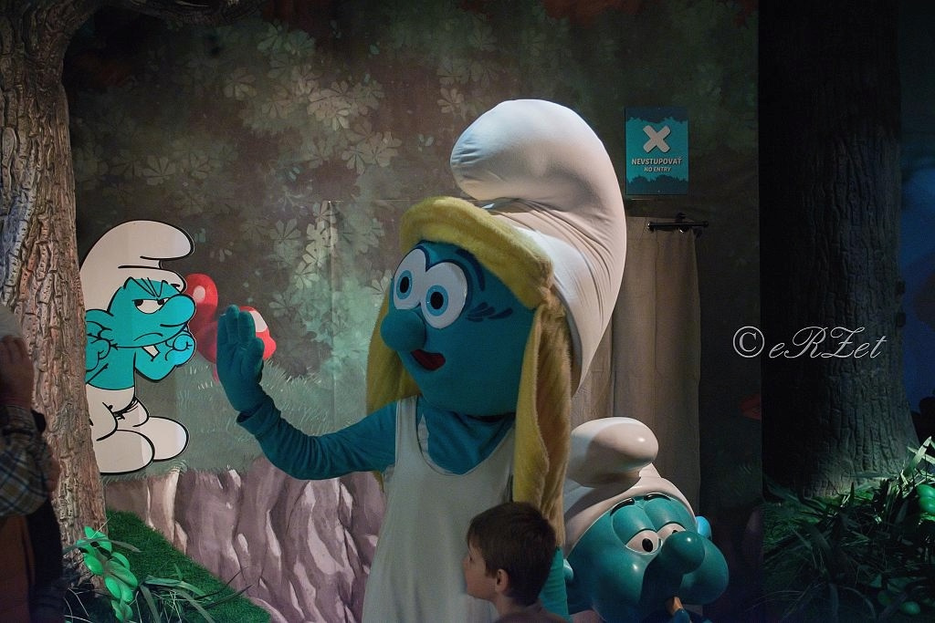 Som vo virtuálnej realite na druhom poschodí a video ma voviedlo do života v Šmolkolese a previedlo celou expozíciou a ja som sa začal prechádzať atrakciami s pozvánkou od Šmolka. Dostal som plánik tohto mini magického sveta. Prešiel som sa lesom. Počas prechádzky kúzelným lesom som sa postupne zmenšoval tak, aby som bol veľký ako Šmolkovia, teda 3 jablká na sebe. Cestou som stretol malých Šmolkov, ktorí ma pozvali ďalej. Kúzelná dedinka so Šmolkovskými hríbikovými domčekmi a aj malými Šmolkami, záhradkou, studňou, sušiakom na prádlo i so športovým náradím – činkami. Pozrel som sa do domčeka Šmolinky, ktorá ma pozvala na veľkú Šmolkoparty. Najväčší domček v dedinke je plný kúziel. V strede sa na ohnisku varí čarovný lekvár. Teraz ma zasa tatko Šmolko pozval, aby som dokončil premenu na Šmolka, tak sa aj stalo. Aby to nebolo také jednoduché, na interaktívnom pni stromu som vyplnil jednoduchý kvíz. Na druhom pni som sa naučil hovoriť šmolkovským jazykom. Videomapping simuluje prechod vodopádom do svetielkujúceho magického lesa, v ktorom je Gargamelov hrad. Preskočil som po kameňoch potok a vydal sa po lavičke na dobrodružnú prechádzku okolo Gargamelovho hradu. Malý Šmolko ma varoval, na čo si mám dávať pozor! Na ceste mi prekáža rieka, ktorú som prekonal, už ani neviem ako. Joj, nie chytil som sa do Gargamelovej pasce, veľkej klietky. Ale nemám strach, Šmolkovia mi prišli pomôcť a zlého Gargamela premohli, zviazali a zhodili na zem. Obrovský Gargamel leží porazený na zemi a ja oslavujem, vyliezol som na lavičku nad neho a šmykol som sa ponad jeho otvorenú papuľu dolu. Nebál som sa keď zo zúfalstva škriekal, hýbal nohami a rukami. Pozor na kocúra, číha vo svojej skrýši: Stlačil som tlačidlo, joj Azrael skočil priamo predo mňa. Aj  Gargamelovu knihu kúziel som si prelistoval, ktorá sa mi menila priamo pred očami. Pomóc, zachránime Šmolkovský les i celú planétu, znič obrovský Gargamelov stroj! Pohol som pákami i ozubeným kolesom, ale vyliezť hore na stroj a zošmyknúť sa po tobogáne dole. Bál som pozrieť oko celý stroj vybuchne. Na záver som v 5D virtuálnej realite zažil nádherný let na chrbte veľkého bociana. Ani dravec – krkavec ma nezhodil. Šmolkovia už na teba čakajú vo svojej Šmolkovskej dedinke a pozývajú ťa na oslavu. Virtuálne som sa takto prešiel Šmolkovským svetom a tak sa šťastne dostal do cieľa.