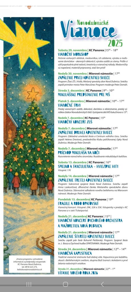 ÚvodKde, kedy, čoNová Dubnica, 29.11. - 31.12.2025, Novodubnické Vianoce Kde, kedy, čo Nová Dubnica, 29.11. – 31.12.2025, Novodubnické Vianoce Od Robert Zvonár 28. novembra 2025 0 120 FacebookXPinterestWhatsApp Tagy#Mesto Nová Dubnica#Nová Dubnica#Novodubnické Vianoce FacebookXPinterestWhatsApp Predchádzajúci článokPôchov, 28.11.2025, Poviem Vám na čo sa opýtaťĎalší článokKošeca, 29.11.2025, Rozprávkové rozsvietenie vianočného stromčeka SÚVISIACE ČLÁNKY Kde, kedy, čo Trenčín, 2.5.2026, Deň hasičov Kde, kedy, čo Ladce, 2.5.2026, Ladecký kotlík Kde, kedy, čo Dubnica nad Váhom, 2.5.2026, Pálenie Ďura