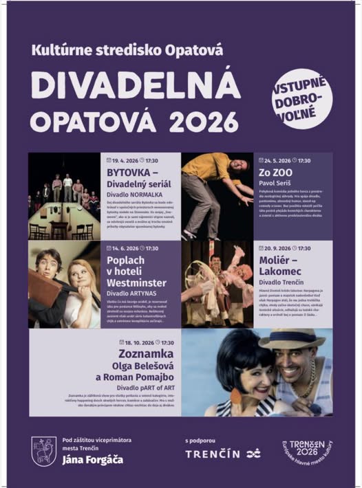 ÚvodKde, kedy, čoOpatová, 19.4., 24.5., 14.6., 20.9., 18.10.2026, Divadelná Opatová 2026 Kde, kedy, čo Opatová, 19.4., 24.5., 14.6., 20.9., 18.10.2026, Divadelná Opatová 2026 Od Robert Zvonár 13. apríla 2026 0 71 FacebookXPinterestWhatsApp Screenshot Tagy#Divadelná Opatová#Divadlo ARTYNAS#Divadlo NORMÁLKA#Divadlo pART of ART#Divadlo Trenčín#Kultúrne stredisko Opatová#Mesto Trenčín#Opatová#Pavl Seriš#Trenčín/Opatová FacebookXPinterestWhatsApp Predchádzajúci článokNad priehradu za Nosickou HviezdouĎalší článokDubnica nad Váhom, Apríl 2026, Aprílový SmartLab. SÚVISIACE ČLÁNKY Kde, kedy, čo Dubnica nad Váhom, 2.5.2026, Pálenie Ďura Kde, kedy, čo Trenčín, 2.5.2026, Deň hasičov Kde, kedy, čo Ladce, 2.5.2026, Ladecký kotlík