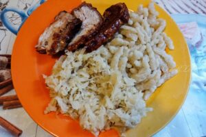 Mäso omyjeme o kožu narežeme ostrým nožom no mriežku, dávame však pozor, aby sme nenarezali aj mäso. Následne do kože vtrieme soľ a celé mäso potrieme olejom. Vložíme ho do pekáčika kožou nahor a pečieme v rúre pri 200 °C asi 30 minút neskôr teplotu znížime no 160 °C pečieme ešte asi 2 hodiny, kým nie je mäso celkom mäkké. Medzi tým si pripravíme kalerábovú kapustu. Cibuľu ošúpeme, nakrájame na drobno a v hrnci na oleji osmažíme dozlatista. Zaprášime ju cukrom o necháme chvíľku skaramelizovať. Neskôr vmiešame na hrubo nestrúhané kaleráby, osolíme, pridáme rascu a za občasného miešania dusíme osi 10 minút. Nakoniec kaleráb dochutíme octom. Podávame s haluškami alebo zemiakovou knedľou.