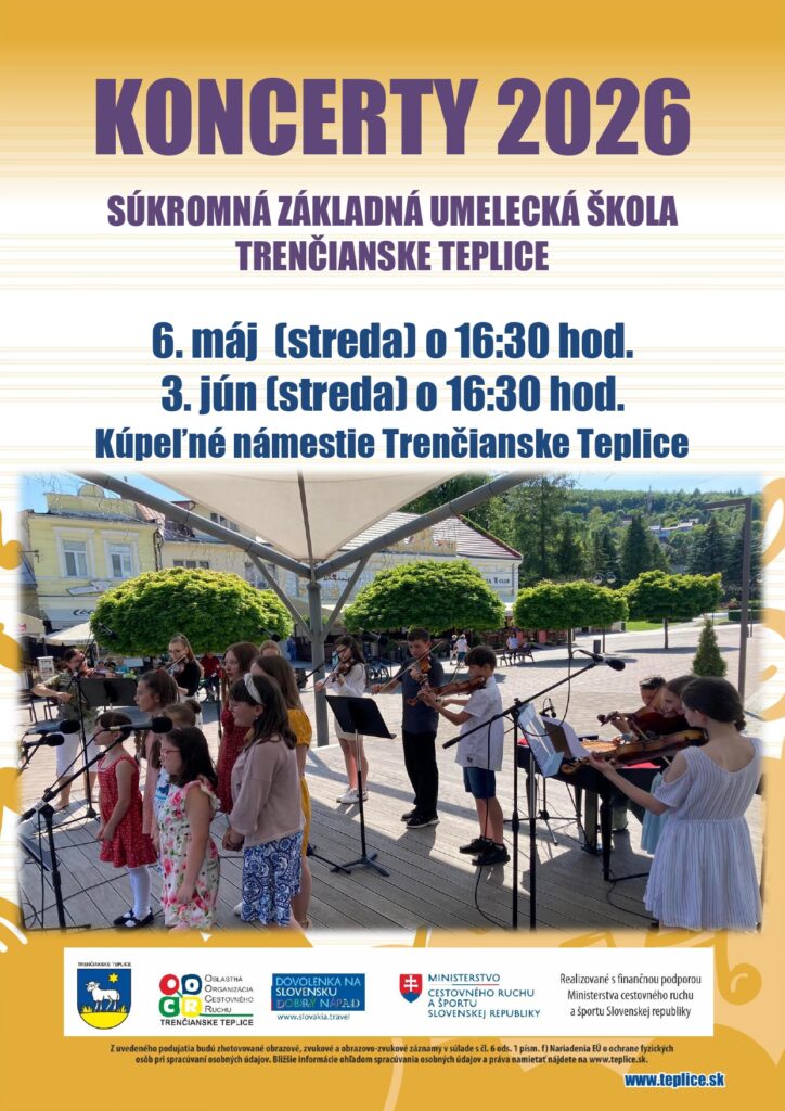 ÚvodKde, kedy, čoTrenčianske Teplice, 6.5 a 3.6.2026, Koncerty SZUŠ Trenčianske Teplice 2026 Kde, kedy, čo Trenčianske Teplice, 6.5 a 3.6.2026, Koncerty SZUŠ Trenčianske Teplice 2026 Od Robert Zvonár 29. apríla 2026 0 7 FacebookXPinterestWhatsApp Tagy#Koncert#Kúpeľné námestie Trenčianske Teplice#Mesto Trenčianske Teplice#Súkromná základná umelecká škola Trenčianske Teplice#Trenčianske Teplice FacebookXPinterestWhatsApp Predchádzajúci článokTrenčín, 2.5.2026, Deň hasičovĎalší článokDubnica nad Váhom, 6.5.2026, Detský raj s rodičmi SÚVISIACE ČLÁNKY Kde, kedy, čo Dubnica nad Váhom, 6.5.2026, Detský raj s rodičmi Kde, kedy, čo Trenčín, 2.5.2026, Deň hasičov Kde, kedy, čo Ladce, 2.5.2026, Ladecký kotlík