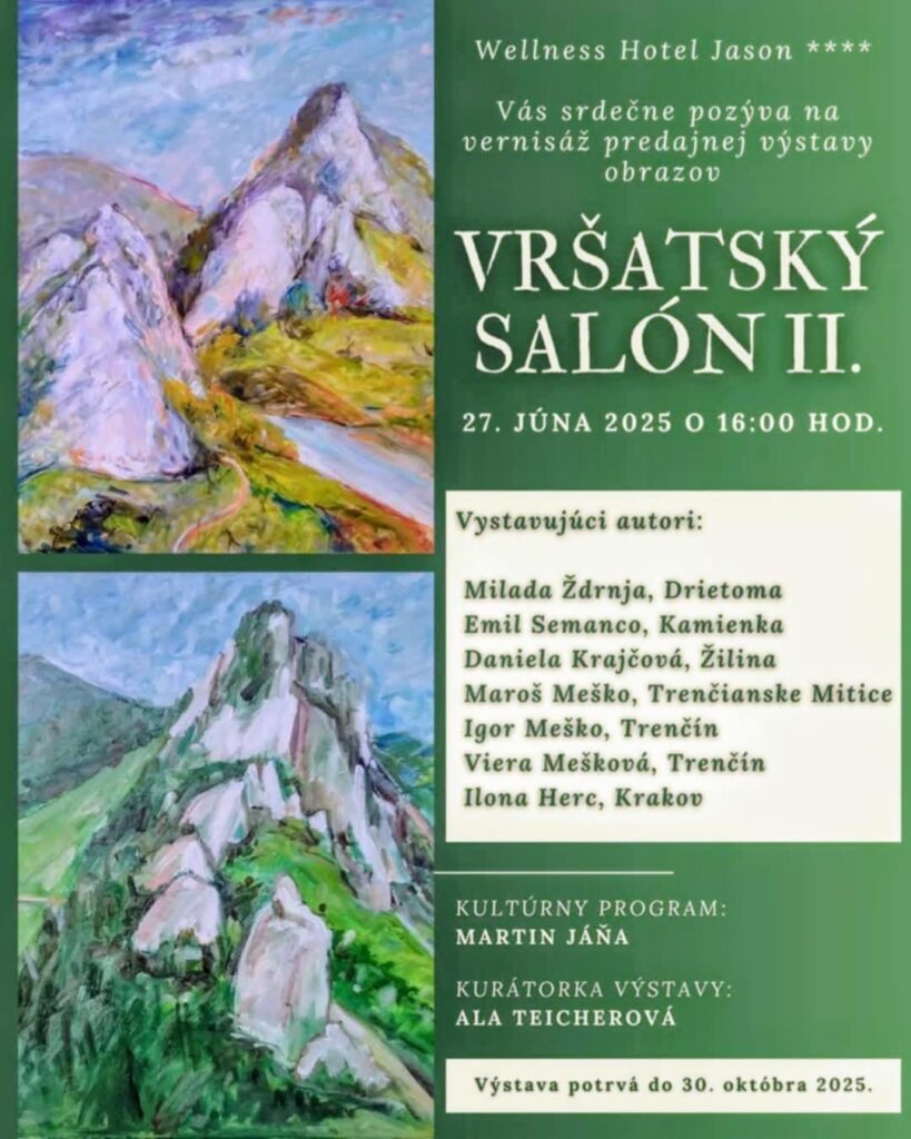 ÚvodKde, kedy, čoVršatské Podhradie, 27.6. - 30.10.2025, Vršatský salón 2 Kde, kedy, čo Vršatské Podhradie, 27.6. – 30.10.2025, Vršatský salón 2 Od Robert Zvonár 24. júna 2025 0 204 FacebookXPinterestWhatsApp Tagy#Ala Teicherová#Hotel Jasoň Vršatské Podhradie#Martin Jáňa#Vršastský salón#Vršatec#Vršatské Podhradie FacebookXPinterestWhatsApp Predchádzajúci článokBeluša, 29.6.2025, Belušský jarmokĎalší článokDubnica nad Váhom/Prejta, 28.6.2025, Jánske športové hry SÚVISIACE ČLÁNKY Kde, kedy, čo Trenčín, 2.5.2026, Deň hasičov Kde, kedy, čo Ladce, 2.5.2026, Ladecký kotlík Kde, kedy, čo Dubnica nad Váhom, 2.5.2026, Pálenie Ďura